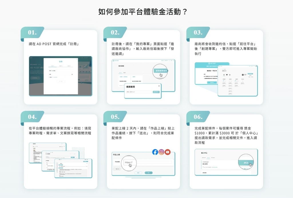 從專案啟動➜到稿件上線➜最後只要在平台貼上合作成品連結 就能領取 AD POST 提供的平台體驗獎金$1000元!