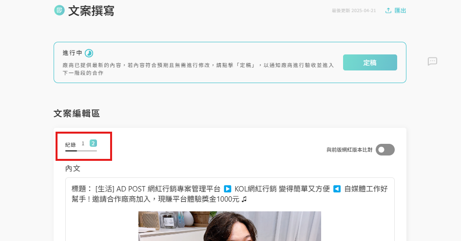 而品牌方也能快速掌握上稿與原始文案的差異,讓合作過程更有效率、減少誤會、維持高品質![]()