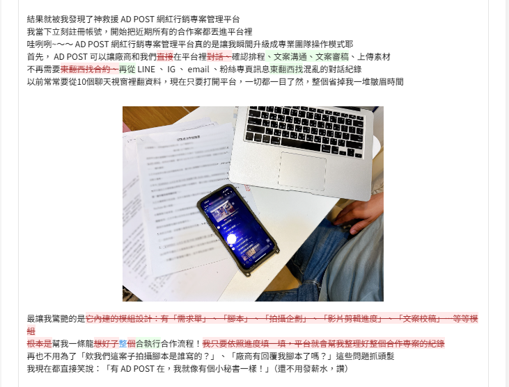 我說真的!使用 AD POST 網紅行銷專案管理平台,雙方同步更新排程後,合作變得超~順~利