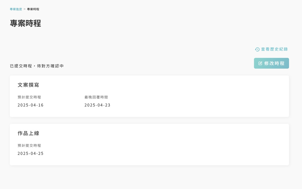 整個合作流程的雙方共享時程、即時更新 像是交稿日和修改回覆時間以及上線時間,全部都記錄在同一個專案時程裡