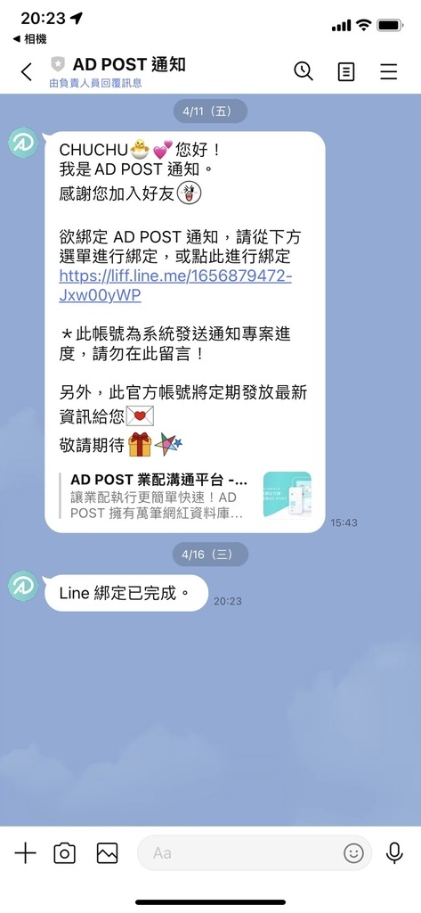 有時候只是忘了提醒,就可能導致時間 delay ,真的讓人壓力山大 現在只要在 AD POST 綁定 LINE 通知,專案一有更新,系統就會自動發送 LINE