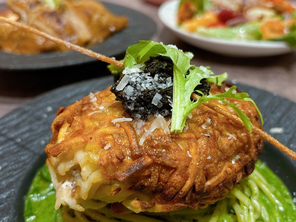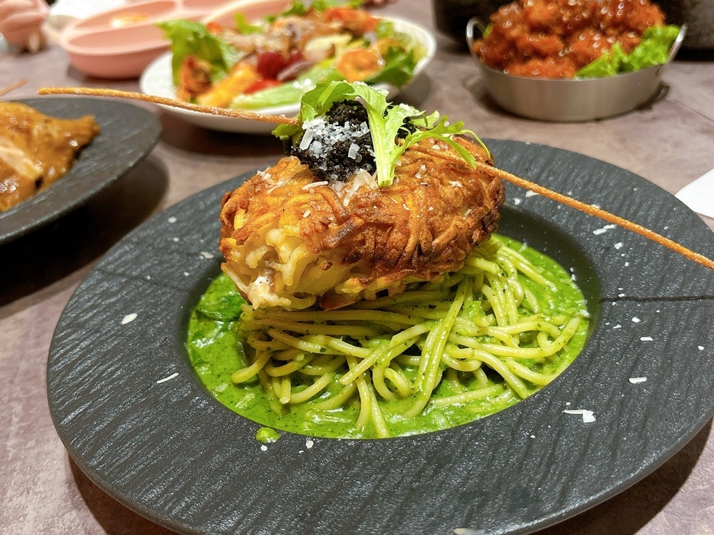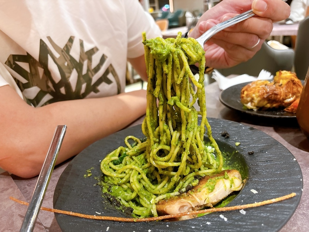 炸得金黃酥脆鬼頭刀魚排搭著青醬麵吃,完全是精緻版的創意海陸大餐