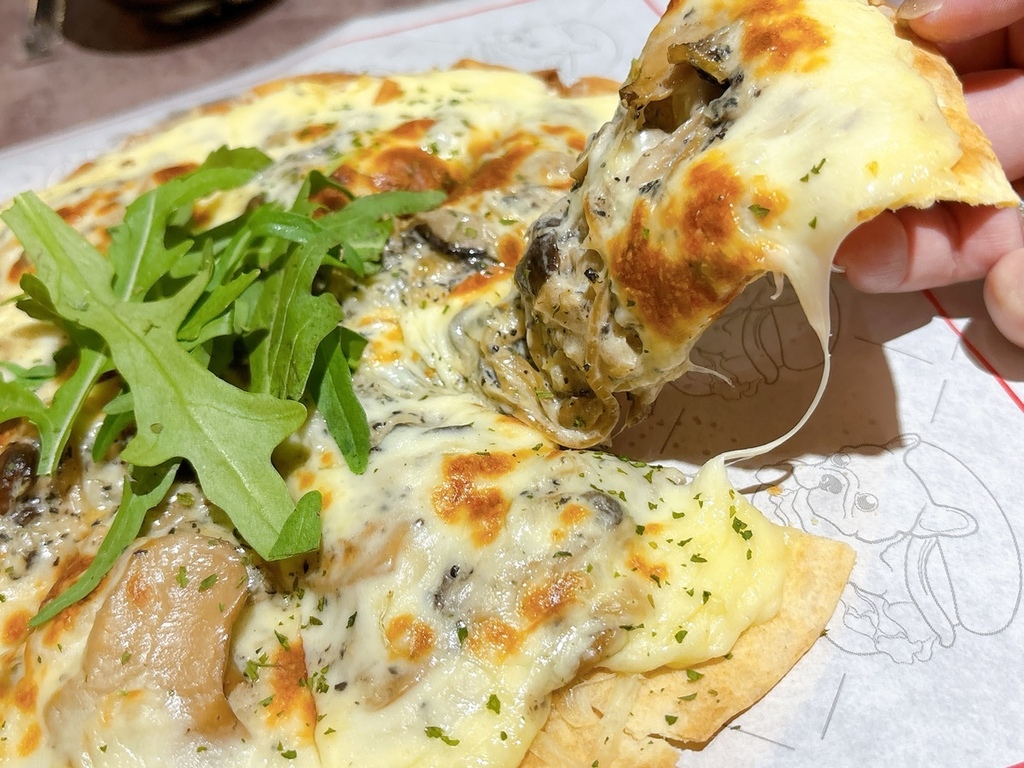 剛上桌就已經菇菇香氣撲鼻,披薩一拉起來,起司瀑布直接炸裂,牽絲程度超誇張
