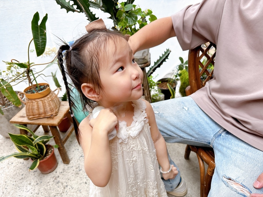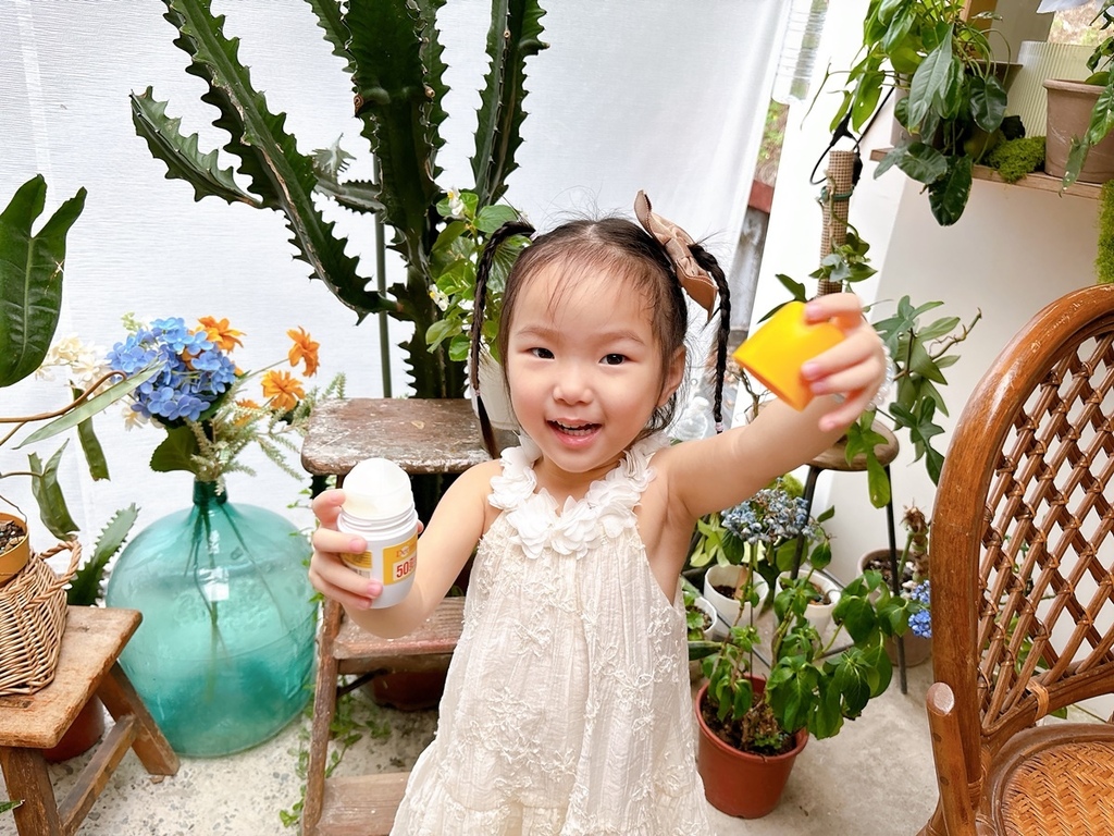 現在出門前,我只要幫她穿好衣服,把Derma滾珠防曬拿出來,她就會說:「我要自己來~」