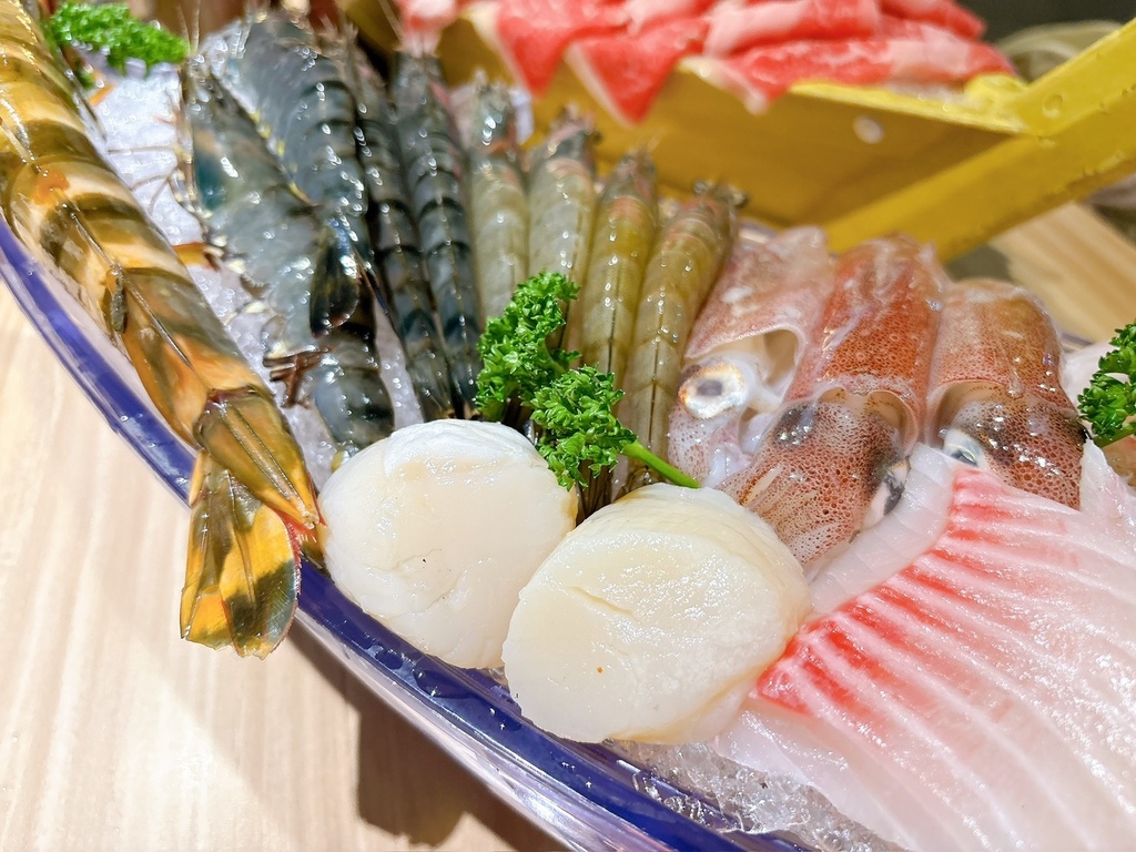 豪華海鮮盤包含超大干貝、蝦子、鯛魚、澎湖小卷等,個個新鮮飽滿
