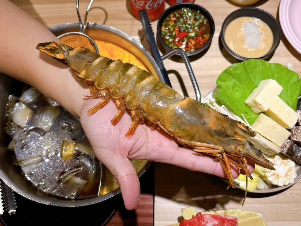 還有加碼送一隻超狂的「霸王手臂蝦」,這隻蝦超巨大,幾乎佔滿半個火鍋![]()