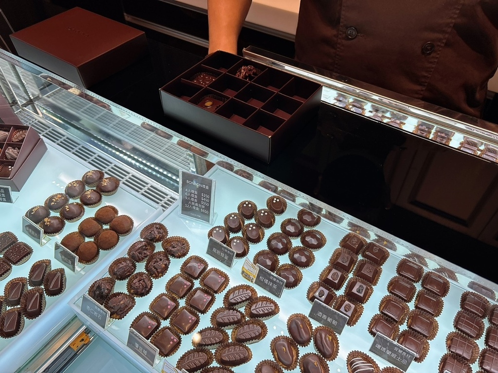 重點是,眼前的展示櫃根本像珠寶店,每顆巧克力都像藝術品般精雕細琢,從色澤、外型到擺設都展現無比講究的工藝感