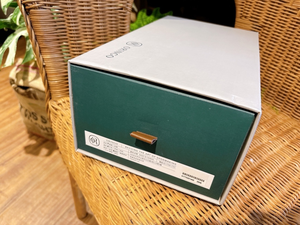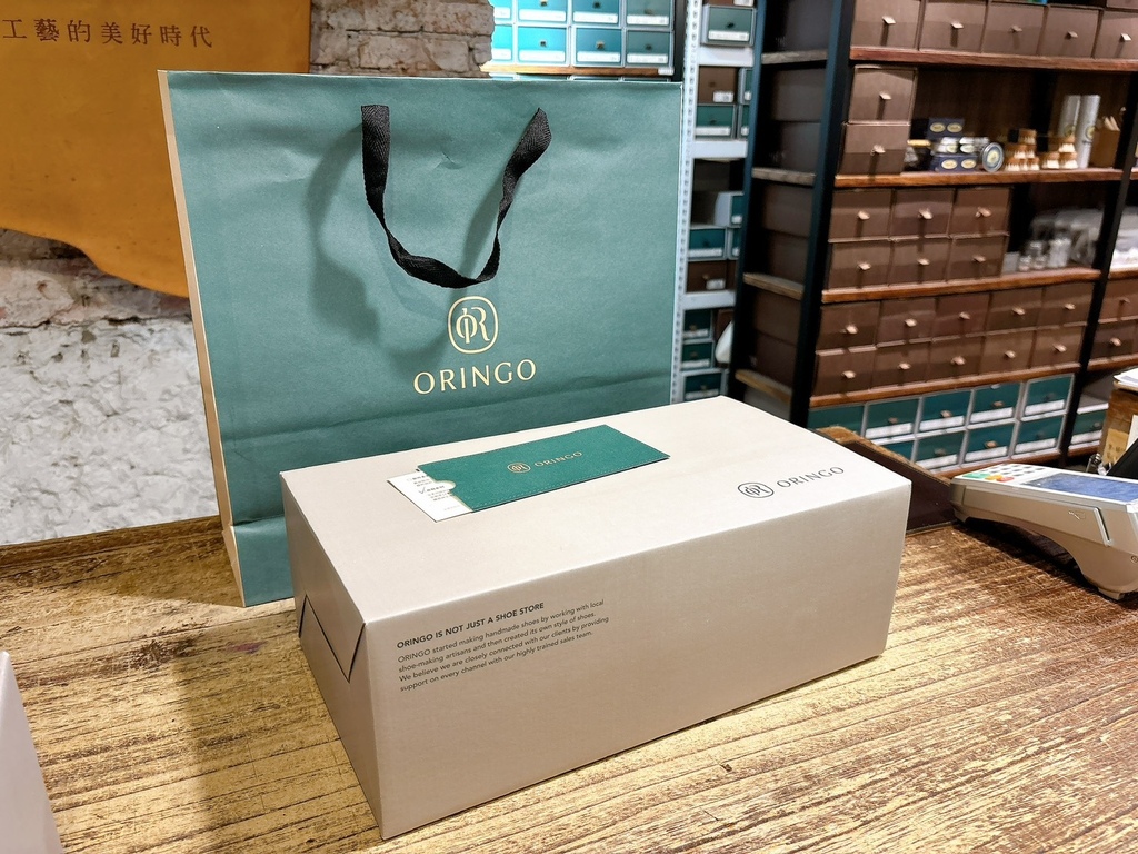 結帳時,店員細心地將鞋子收進質感霧面的鞋盒裡,外層再套上帶有LOGO的深綠色紙袋